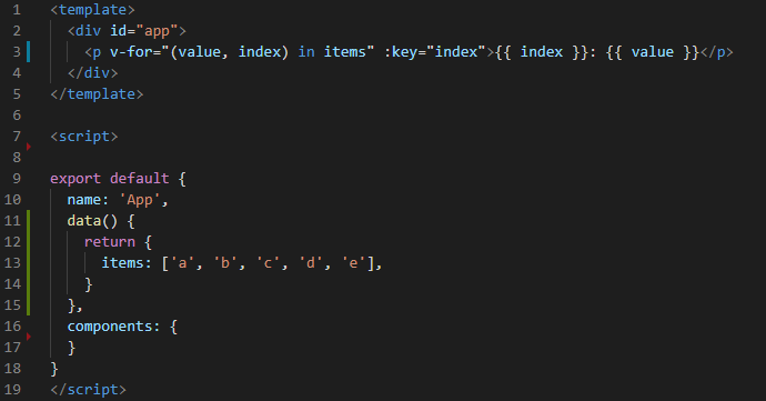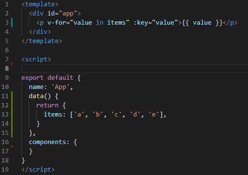 - HTML 태그 속성으로 v-for="value in items" :key="value" 사용하고 태그 안에 {{ value }} 이용